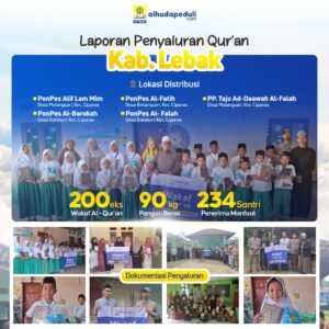 Alhamdulillāhirabbil ‘ālamīn. Dengan izin Allah serta dukungan para donatur, Al-Huda Peduli telah melaksanakan kegiatan Penyaluran Wakaf Al-Qur’an di wilayah Kabupaten Lebak, Banten. Program ini bertujuan