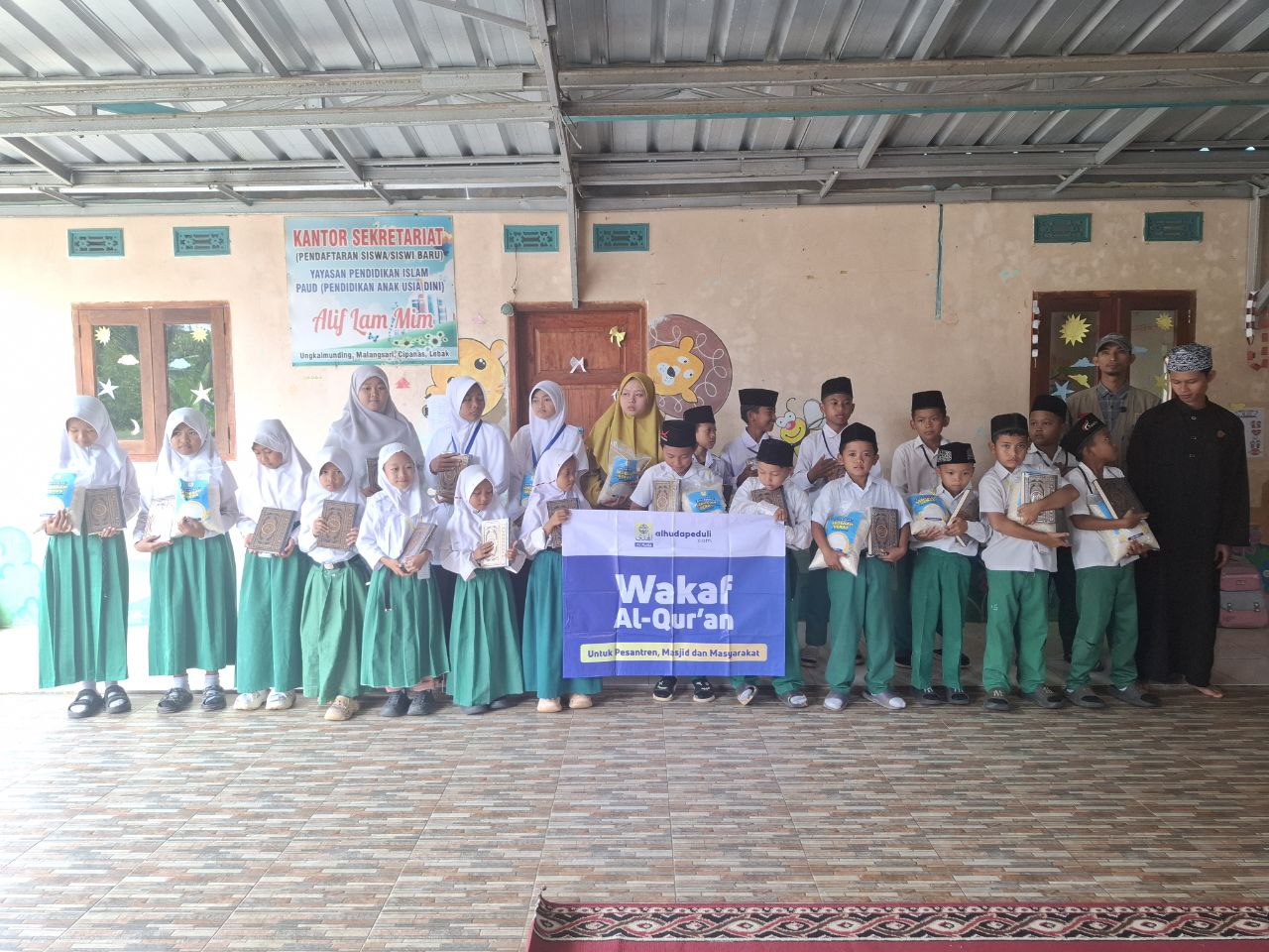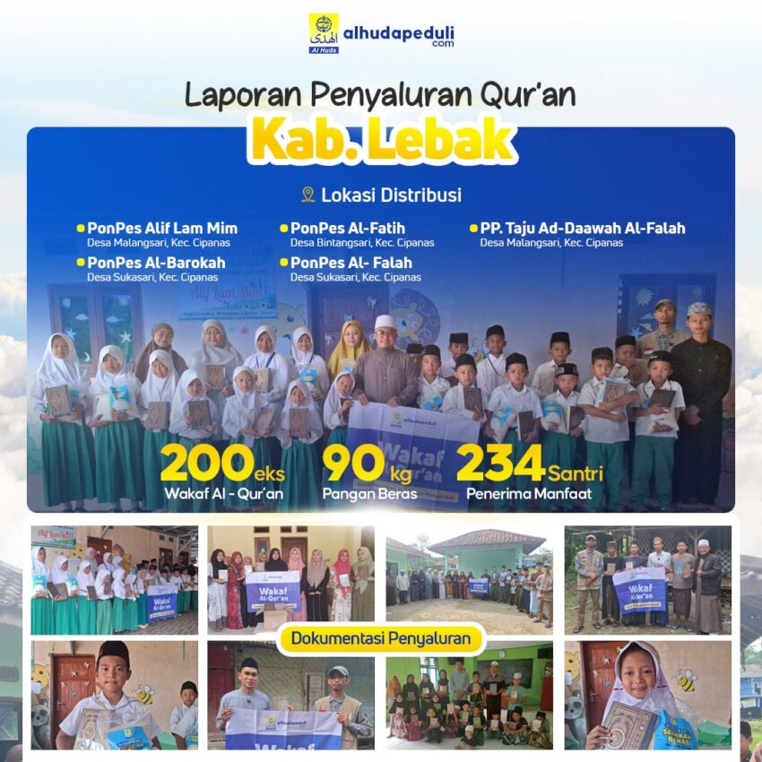 Alhamdulillāhirabbil ‘ālamīn. Dengan izin Allah serta dukungan para donatur, Al-Huda Peduli telah melaksanakan kegiatan Penyaluran Wakaf Al-Qur’an di wilayah Kabupaten Lebak, Banten. Program ini bertujuan untuk mendukung kegiatan belajar mengajar Al-Qur’an di pesantren serta meningkatkan semangat para santri dalam mempelajari dan mengamalkan Al-Qur’an.