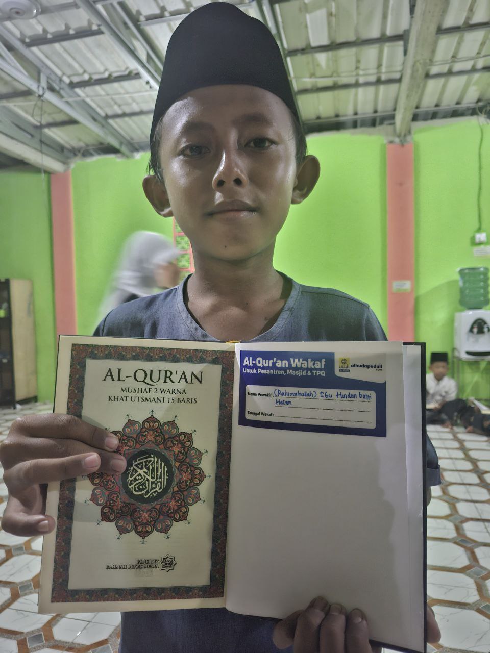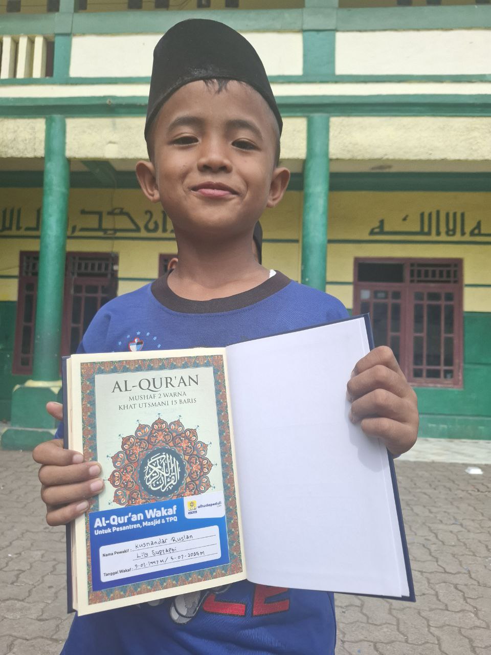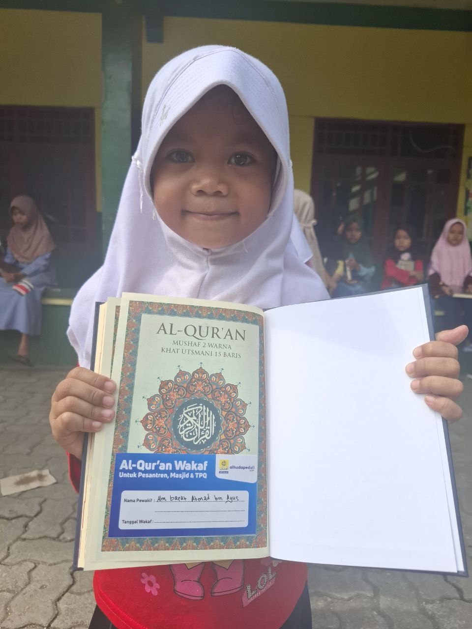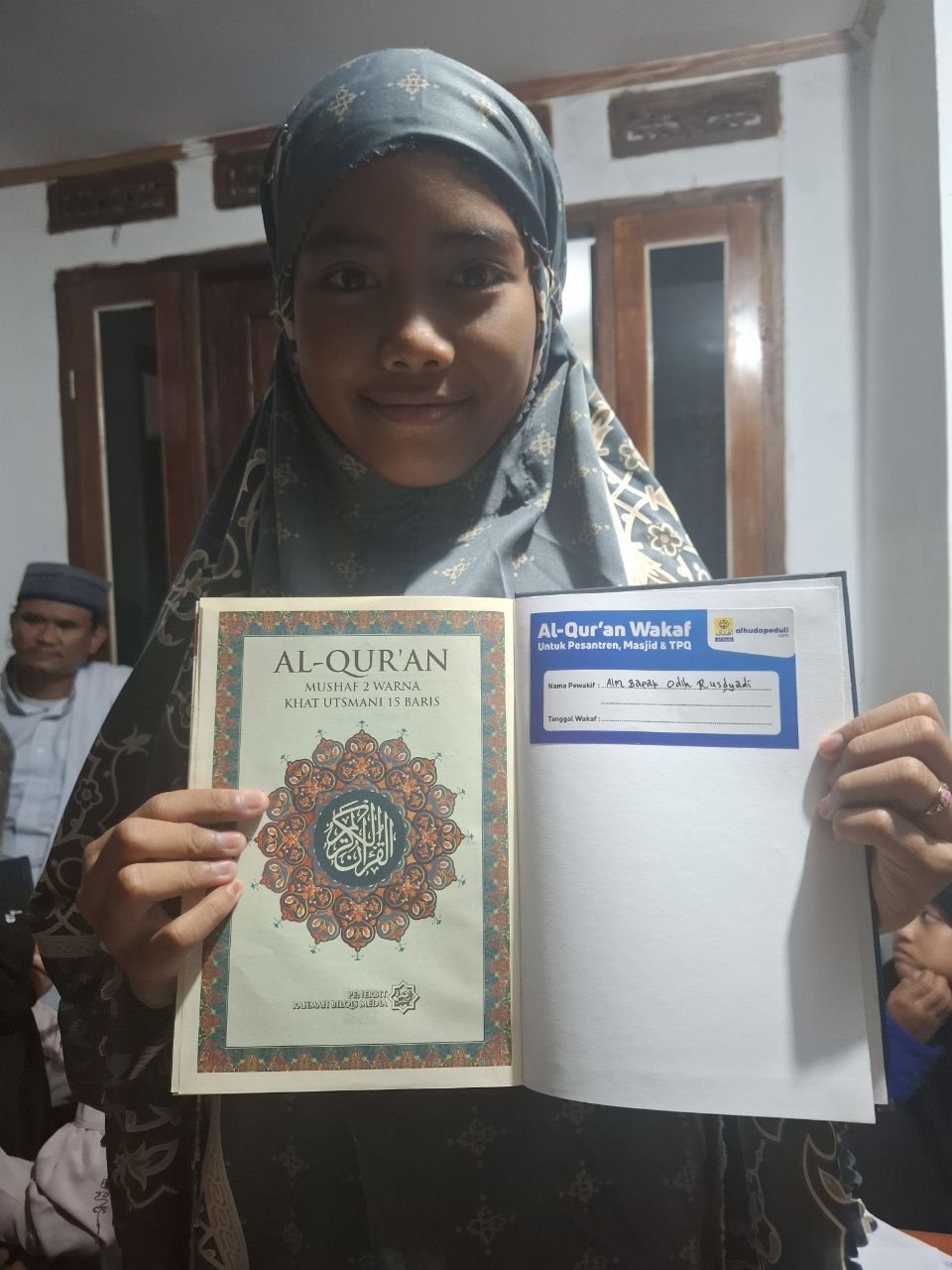 Bagi para santri di pelosok desa, mushaf Al-Qur’an bukanlah sesuatu yang mudah mereka dapatkan. Banyak di antara mereka yang sebelumnya harus berbagi satu mushaf untuk belajar bersama-sama. Kini, dengan adanya bantuan wakaf dari para dermawan, mereka bisa lebih leluasa dalam membaca dan menghafal ayat-ayat Allah tanpa terhalang keterbatasan.